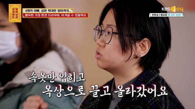 “방에 가둬 놓고 때리고, 머리끄덩이 잡히는 것과 싸대기는 기본. 동생들도 육아해야 했다. 학교도 뒷전으로 하고 집안일을 다 했다.”라는 사연자. 그는 당시 “육아 우울증이 왔다”라고 밝혔다. 학교에 적응을 못 하자 엄마가 “자퇴하고 돈 벌라”고 했고, 아르바이트를 시작했지만, “번 돈은 통신비, 교통비 제외하고는 모두 가져갔다”고 털어놨다.