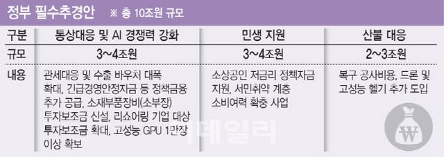 필수 추경의 용처별 규모는 총 10조원 수준이다. 최상목 경제부총리 겸 기재부 장관이 지난 8일 열린 경제관계장관 간담회에서 △통상 대응 및 AI 경쟁력 강화 3조~4조원, △민생 지원에 3조~4조원 규모의 필수 추경을 추진하겠다고 밝혔다. 대형 산불 대응 및 피해 지원과 관련해선 구체적인 수치를 밝히지 않았으나, 총액이 10조원 규모라는 점에서 2조~3조원 규모가 될 것이라는 관측이 나온다.