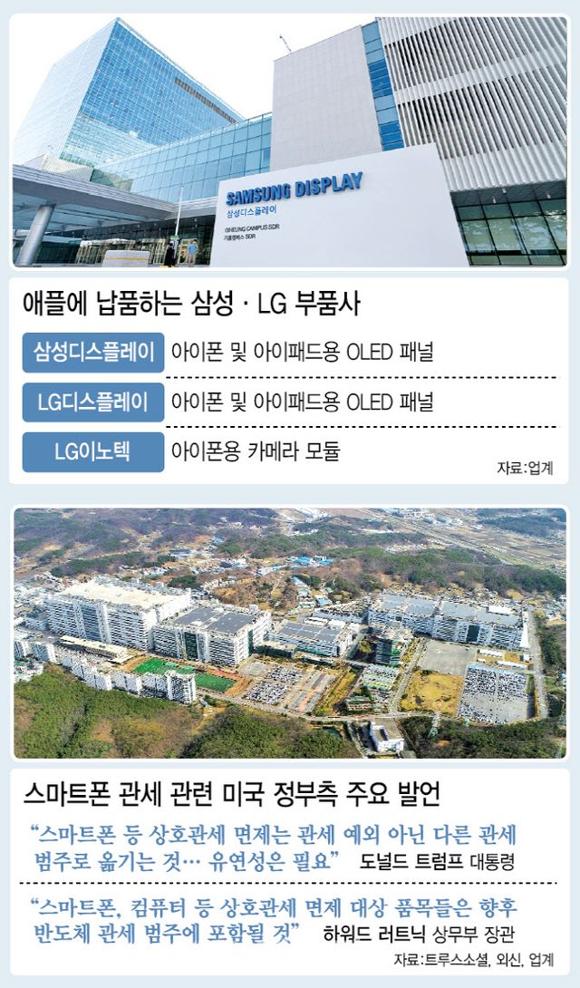 한숨 돌렸던 삼성·LG 부품사들은 재차 안갯속에 놓였다. 삼성디스플레이와 LG디스플레이(034220)는 애플에 아이폰용 유기발광다이오드(OLED) 패널을 공급하고 있다. 삼성디스플레이는 대부분의 매출을 모바일용 제품을 포함한 중소형사업부가 내고 있다. LG디스플레이는 스마트폰과 워치용 패널 등 모바일 분야의 매출 비중이 33.6%다. 스마트폰 쏠림 현상이 심하지는 않지만 모니터·노트북 등 IT용 제품 매출(35.4%)에 이어 작지 않은 수익을 내고 있다. LG이노텍(011070)은 매출의 약 80%를 애플과의 거래로 창출하고 있다. LG이노텍은 카메라모듈을 애플에 납품한다.