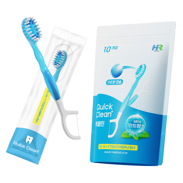 퀵클린은 칫솔, 민트향 캡슐형 구강세정제, 혀 클리너, 치실, 이쑤시개 등 일상적인 구강 관리에 필요한 5가지 기능을 하나의 제품에 통합한 일회용 구강케어 솔루션이다. 물 없이도 사용 가능한 구조로 설계돼, 여행, 출장, 외출 등 다양한 상황에서도 간편하고 위생적인 구강관리를 가능하게 한다.