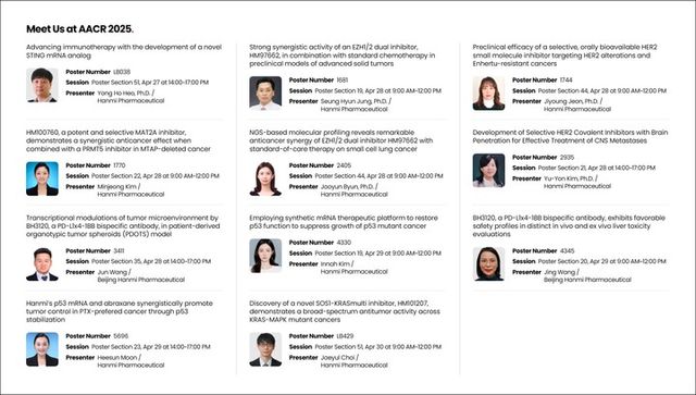 한미약품은 이번 AACR에서 △EZH1/2이중저해제(HM97662) 2건 △선택적 HER2 저해제(HM100714) 2건 △MAT2A 저해제(HM100760) △SOS1 저해제(HM101207) △STING mRNA 항암 신약 △p53-mRNA 항암 신약 2건과, 북경한미약품이 주도적으로 개발하고 있는 이중항체 플랫폼(펜탐바디) 기반의 △BH3120 2건 등 총 7개 신약 후보물질에 관한 연구 결과를 포스터로 발표한다.