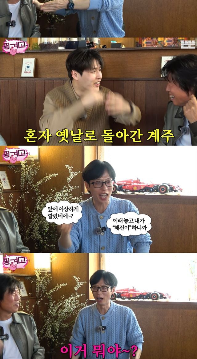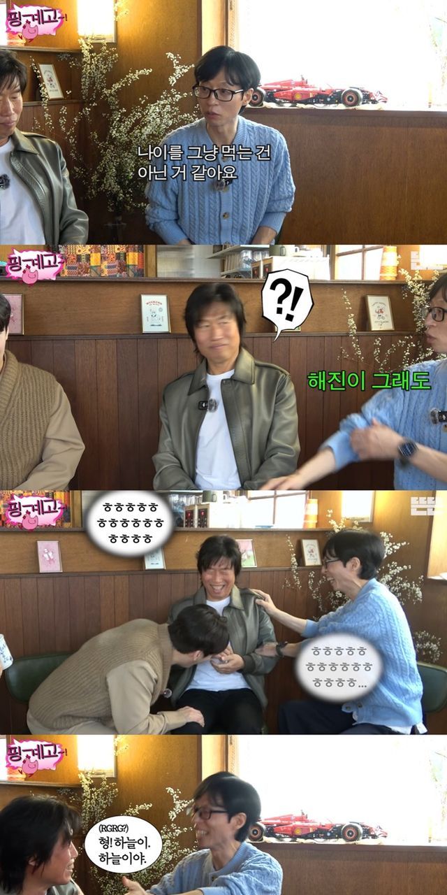 하지만 그는 이내 3살 형인 유해진을 보고 "해진이 그래도"라고 이야기를 이어가다가 당황해 모두에게 웃음을 안겼다.