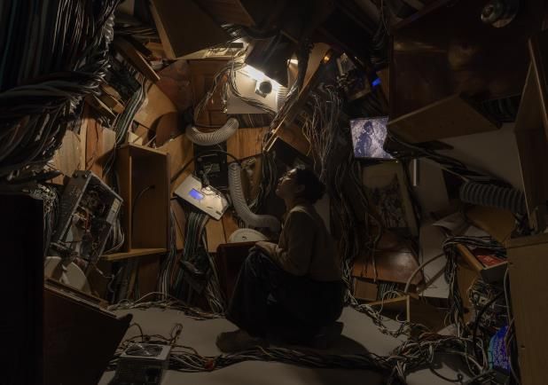 박예나의 〈사건의 부분_챔버 n.3〉(2025)은 2024년에 진행됐던 개인전 《Interstitium》으로부터 다시 선보이는 융합체 설치이다. ‘간질’이라는 1차적 사전적 의미로 검색되는 이 영문 제목은 그의 작업이 시각적으로 보여주는 압도감과 일치하는 듯하다. 올해 그의 아티젝타는 경기도미술관에서 한층 새로운 방식으로 증식하고 거대해진 모습이다. 아티젝타는 인공[artificial], 사물[object], 데이터[data]를 조합한 용어이다. 박예나는 아티젝타를 인간을 숙주로 능동적인 증식을 꾀하고 정보의 세계 속에서 자신의 생존을 위해 인간을 사용하는 새로운 생명체로 설정했다. 즉 인간을 편리하게 만들기 위한 최선의 형식으로 발현된 장치와 데이터가 인간을 가장 깊이 알고 있을 것이라는 작가의 가설에서 출발한 것이다.