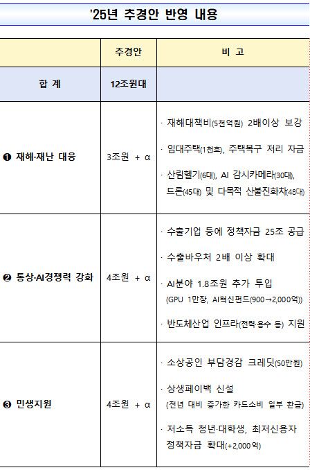 용처별로는 △대규모 재해·재난 대응 3조원 △통상환경 변화 대응, 첨단산업 경쟁력 강화 4조원 △소상공인·취약계층 지원 4조원 △인공지능·반도체 2조원 이상씩을 각각 지원하겠다는 것이 정부의 계획이다. 기존 ‘통상대응 및 AI 경쟁력 강화’ 부문에서 최대 4조원이 반영될 것으로 알려졌지만, 이를 따로 분리해 각각 4조, 2조원씩 예산을 더 늘린 것이 특징이다.