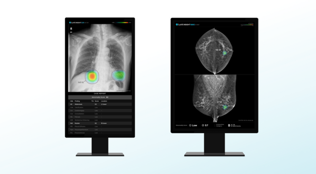 루닛 흉부 엑스레이 AI 영상분석 솔루션 '루닛 인사이트 CXR'(왼쪽)과 유방촬영술 AI 영상분석 솔루션 '루닛 인사이트 MMG'. ⓒ 루닛