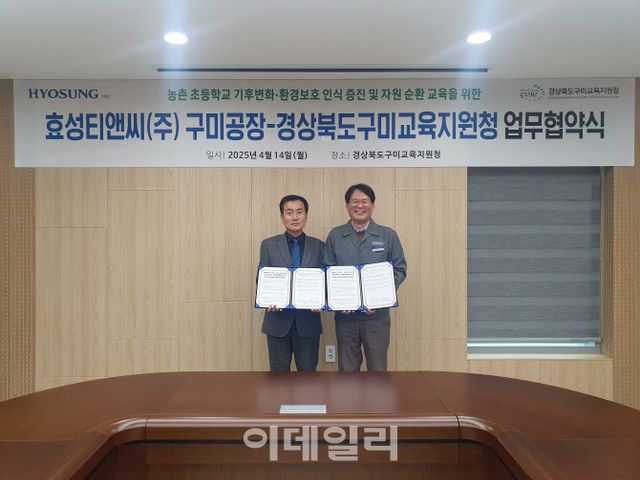 효성티앤씨는 14일 경북 구미교육지원청과 구미 지역 농촌 초등학생 대상 환경교육 활성화를 위한 업무협약(MOU)을 체결했다. 협약식에는 효성티앤씨 구미공장 유상훈 공장장과 구미교육지원청 남성관 교육장이 참석했다.
