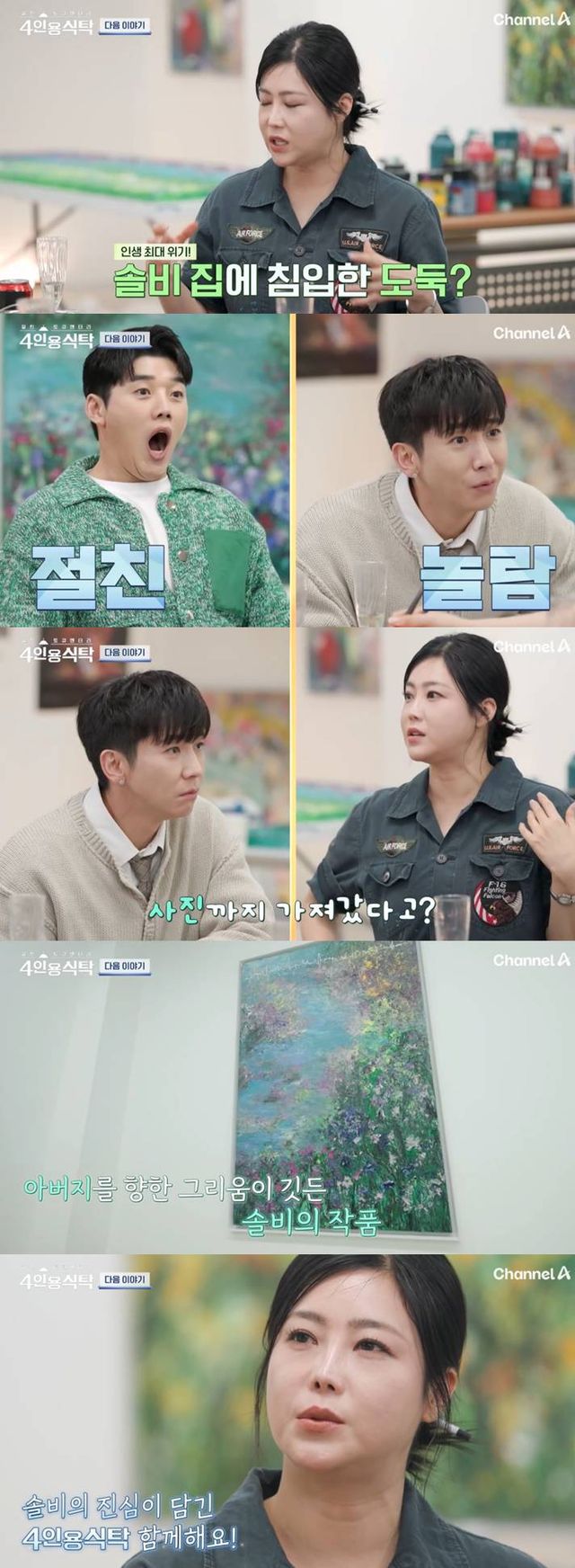 14일 채널A '절친 토큐멘터리-4인용식탁' 방송 말미 예고편에서 솔비는 과거 집에 도둑이 들었던 일화를 전했다.