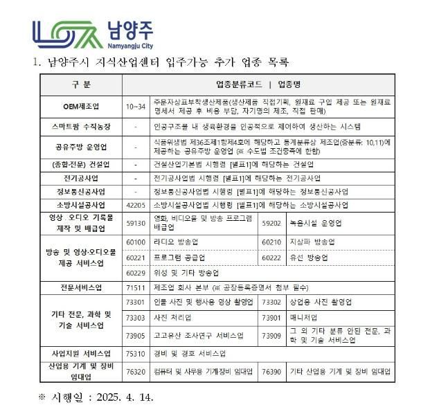 [와이뉴스] 남양주시는 지난 14일 지식산업센터 입주 가능 업종 추가를 고시했다고 15일 밝혔다.