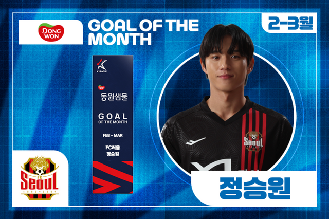 FC서울 정승원이 2025시즌 2-3월 K리그 ‘안심을 마시다 동원샘물 이달의 골’을 수상했다.