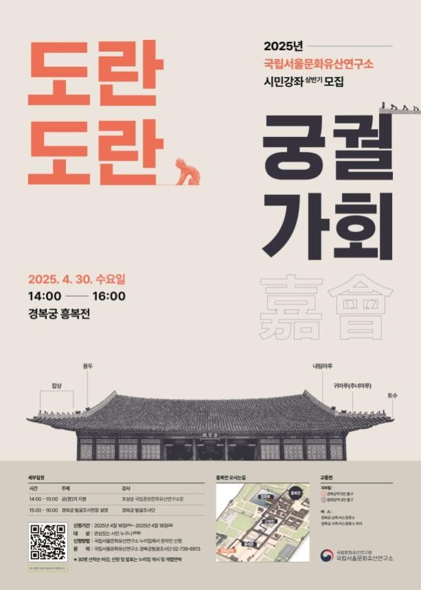 국가유산청 국립문화유산연구원 국립서울문화유산연구소는 오는 4월 30일과 9월 24일 오후 2시부터 4시까지 경복궁 흥복전(서울 종로구)에서 2025년 「도란도란 궁궐 가회(嘉會)」를 개최한다.