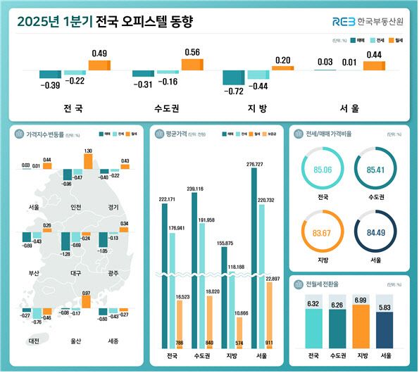 지방은 0.72% 하락해 전분기(-0.86%)대비 하락폭이 둔화했다. 공급이 많은 지역을 중심으로 오피스텔 매매 수요가 감소한 가운데 가격 하락세가 장기간 지속됨에 따라 낙폭이 다소 둔화된 모습이다.