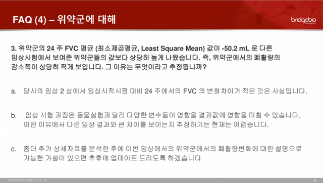 또 위약군의 폐활량 감소폭이 다른 유사 임상 대비 작게 나타난 점, 시험약군의 수치가 오히려 더 나쁘게 나온 점에 대해서는 "임상 시험 과정은 동물실험과 달리 다양한 변수들이 영향을 결과값에 영향을 미칠 수 있다"면서 "임상시험의 특성상 어떤 변수로 인해 이러한 수치가 나왔는지 가설을 수립하여 설명하기는 현 시점에서는 어렵다"고 말했다.
