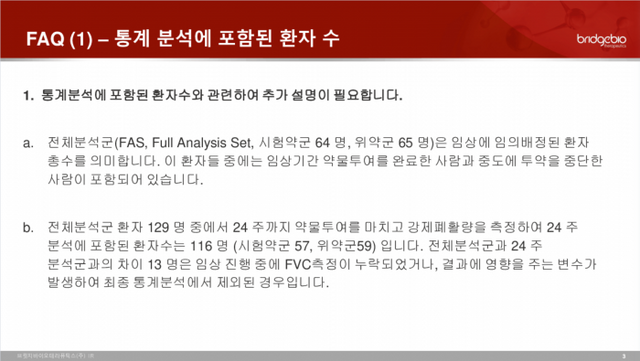 15일 브릿지바이오는 BBT-877의 임상 2상 관련 온라인 IR을 진행했다. 앞서 회사는 IPF 환자를 대상으로 한 BBT-877의 임상 2상 탑라인 결과를 지난 14일 공시한 바 있다. 이번 시험은 미국, 한국, 이스라엘, 호주, 폴란드 등 5개국, 총 41개 기관에서 130명의 환자를 대상으로 진행됐다. 전체 분석군(FAS)은 129명이었고, 이 중 116명이 24주차까지 투약을 완료했다.