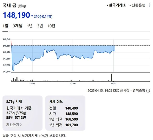 국내 금시세(금값)가 15일(한국 시각) 오후 하락세(전 거래일 대비)를 보이고 있다.