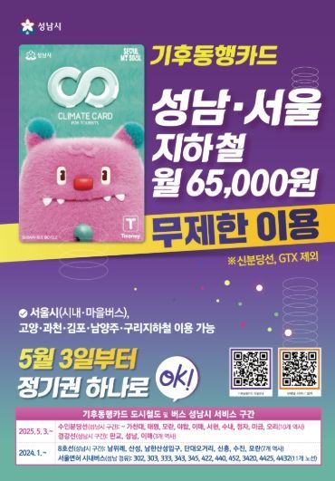 오는 5월 3일 첫차부터 성남시 수인분당선 10개 역사(가천대∼오리 구간) 및 경강선 3개 역사(판교∼이매 구간)에서 기후동행카드 사용이 가능해진다.