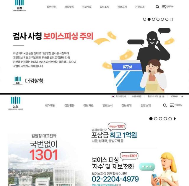 실제 검찰청 사이트(위)와 보이스피싱범이 만들어낸 가짜 검찰청 사이트(아래)