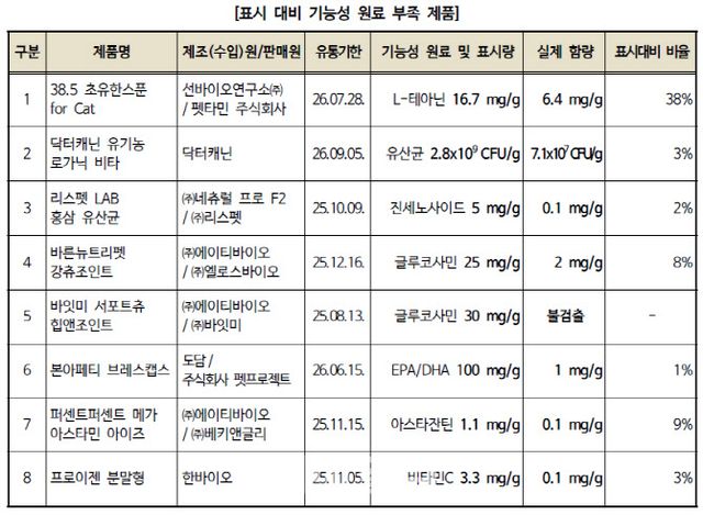 한국소비자원은 15일 온·오프라인에서 판매하는 반려동물 영양제 20개 제품의 기능성 원료 함량을 조사했다며 이같이 밝혔다.