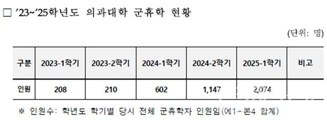 15일 국회 보건복지위원회 소속 서명옥 국민의힘 의원이 교육부로부터 제출받은 자료에 따르면 2025년 1학기 의과대학 재학생 중 군 휴학 인원은 총 2074명에 달하는 것으로 나타났다. 일반적으로 의과대학에 재학하는 학생은 의과대학을 졸업한 뒤 ‘의무사관 후보생’이 돼 군의관 또는 공보의로 입영한다. 그러나 이들이 현역병으로 입영하면서 군의관과 공보의로 입영할 인원이 부족해질 수 있다는 우려가 제기된다.