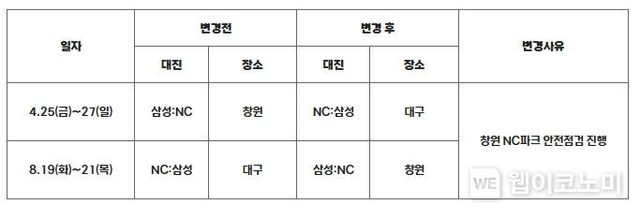 (웹이코노미) KBO는 4월 25일(금)~27일(일) 창원에서 개최 예정이던 삼성과 NC의 3연전과 8월 19일(화)~21일(목) 대구에서 개최 예정이던 NC와 삼성의 3연전의 경기 장소를 다음과 같이 변경했다.