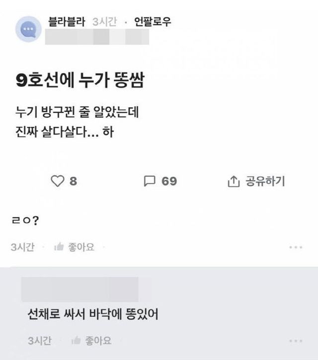 한 누리꾼 A씨는 블라인드에 “9호선에 누가 X쌌다. 방구뀐 줄 알았는데 살다살다. 선 채로 싸서 바닥에 있다”고 적어 눈길을 끌었다.