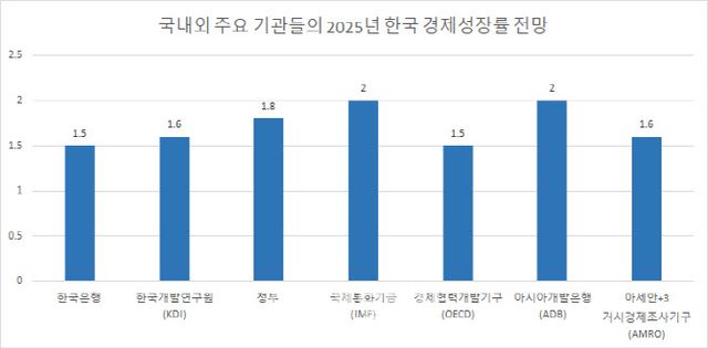 영국계인 캐피털이코노믹스는 상호관세 발표 이전인 지난달 말 미약한 정부 지출과 부동산 부문 침체를 이유로 올해 한국 성장률 전망치를 기존 1.0%에서 0.9%로 낮췄다. 마찬가지로 상호 관세 발표 직전 성장률 전망치를 0.9%로 낮췄던 JP모건은 트럼프 정부의 관세 발표 이후 0.7%로 재차 하향 조정했다. 씨티도 이달 들어서만 올해 성장률 전망치를 두 번 낮추면서 0.8%를 예상했다. ING은행도 최근 한국의 올해 성장률 전망치를 0.8%로 내려 잡았다.