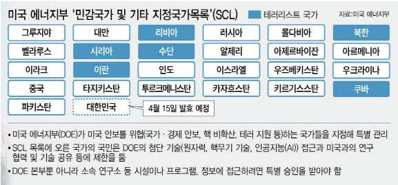 15일 외교 소식통과 업계에 따르면 DOE는 올 1월 초 한국을 최하위 단계인 ‘기타지정국가’로 포함한 새 민감국가 리스트를 이날 발효했다.