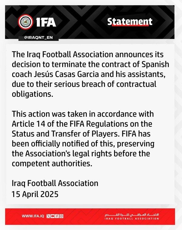 15일(한국시간) 이라크축구협회는 공식 소셜미디어(SNS)를 통해 “스페인 감독 카사스 감독과 코칭스태프를 경질했다. 심각한 계약 의무 위반이 있었다”라고 발표했다. ‘계약 의무 위반’이라는 표현이 강한 측면이 있는데 현지 매체에 따르면 성적 부진에 의한 경질이다.