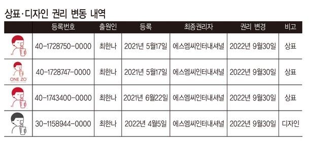 ‘KIPRIS 특허정보 검색서비스’에 따르면 최 대표는 현재 에스엠씨인터내셔널이 권리자로 등록돼 있는 상표·디자인 6개(상표 5개, 디자인 1개) 중 4개(상표 3개, 디자인 1개)의 이전 권리자였다. 최 대표는 2021년 5월17일 상표 2개, 2021년 6월22일 상표 1개의 상표권자로 등록됐으며, 디자인 1개에 대한 권리는 2022년 4월5일 취득했다.