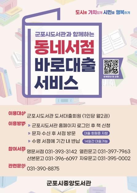 ‘동네서점 바로대출 서비스’ 참여 서점은 명문서점(산본천로 193), 산본문고(광정로 70), 열린문고(군포로464번길 2), 자유문고(산본천로 62) 등 모두 4곳이며, 방문하기 쉬운 서점을 지정해 서비스를 신청하면 된다.