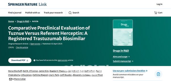 글로벌 시장 진출을 앞두고 전임상 단계부터 오리지널약과 동등한 고도의 유사성을 입증한 논문을 출판함으로써 제품에 대한 자신감을 피력한 것이다. 여기에 투즈뉴 글로벌 3상 임상을 주도한 세계적인 바이오시밀러 권위자 사비에 피보(Xavier Pivot) 교수팀이 제1저자로 나서며 힘을 보탰다.