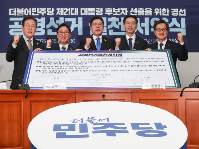 민주당은 16일 오전 서울 여의도 당 대표실에서 공명선거 실천 서약식을 열었다. 이날 서약식에는 박찬대 당대표 직무대행 겸 원내대표를 비롯해 이재명·김경수·김동연 경선 후보자들이 참석했다.