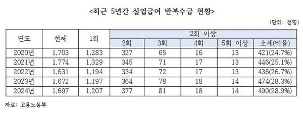 실업급여 반복수급자는 2020년부터 꾸준히 증가하고 있는 추세다. 2020년에는 2회 이상 수급자가 42만1000명(24.7%)이었으나 2021년 44만6000명(25.1%), 2022년 43만6000명(26.7%), 2023년 47만4000명(28.3%), 2024년 49만명(28.9%)으로 계속해서 늘고 있다.