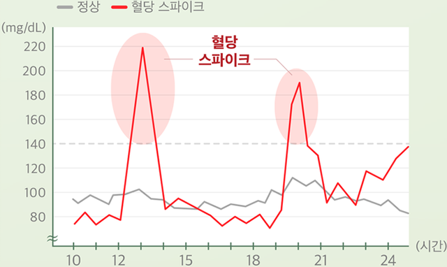 일반적으로 공복혈당 수치가 100mg/dL 미만이면 정상, 100에서 125이면 공복혈당장애로 당뇨 전 단계, 126 이상이면 당뇨로 진단한다. 하지만 당화혈색소나 식후 1~2시간 혈당은 자주 측정하지 않는 경우가 많아 혈당 스파이크는 놓치기 쉽다.