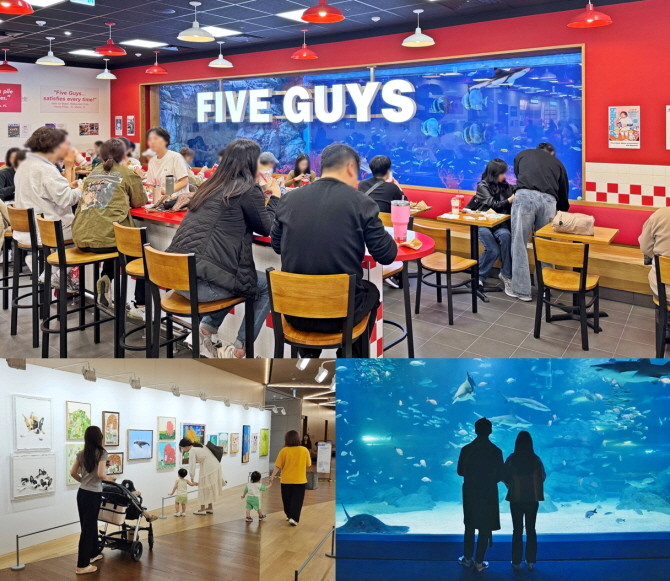 갤러리아백화점에 따르면 지난달 14일 백화점 내 오픈한 파이브가이즈 광교는 당일 오픈런에 이어 하루 평균 1500명 이상이 방문하며 큰 인기를 끌고 있다. 새 매장은 아쿠아리움이 적용된 세계 최초의 파이브가이즈로 가족 단위 방문객들이 줄을 잇고 있다.