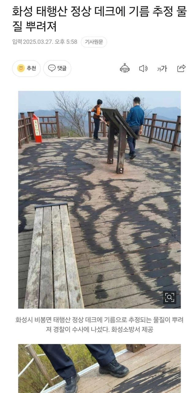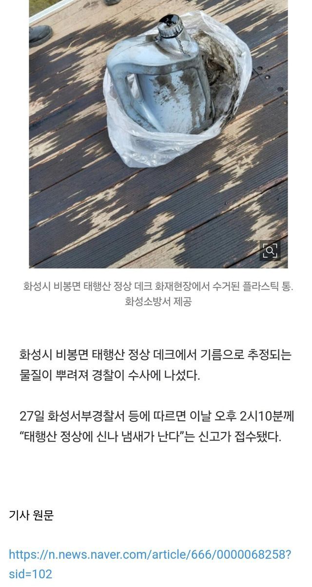 화성 태행산 정상 데크에 기름 추정 물질 뿌려져