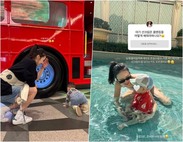 그는 이어 16일에는 아들과 수영장에서 물놀이를 즐기는 사진을 게재하며 '아기 선크림은 클렌징을 어떻게 해줘야 하나요?'라는 질문을 남기기도 했다. 손연재는 "눈에 들어갈까봐 세수도 조심스럽고, 기존 바디워시로 선크림이 잘 닦이는지도 모르겠어요"라며 초보 엄마다운 고민을 털어놓기도 했다.