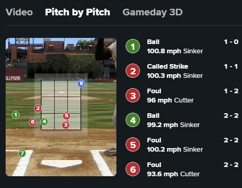 삼진 위기에서 숨을 고른 이정후는 5구째 존 가운데로 들어오는 100.2마일의 싱커를 다시 한 번 커트해낸 뒤, 6구 바깥쪽 컷 패스트볼을 재차 걷어낸 뒤, 땅으로 떨어지는 7구째 컷 패스트볼을 참아냈다. 그리고 이어진 8구, 자신의 몸쪽 위로 강하게 붙여오는 100마일의 싱커를 그대로 받아쳐 1루수와 2루수 사이를 가르는 안타로 만들어냈다. 그 사이 3루주자가 홈을 밟으며 타점으로 이어졌다.