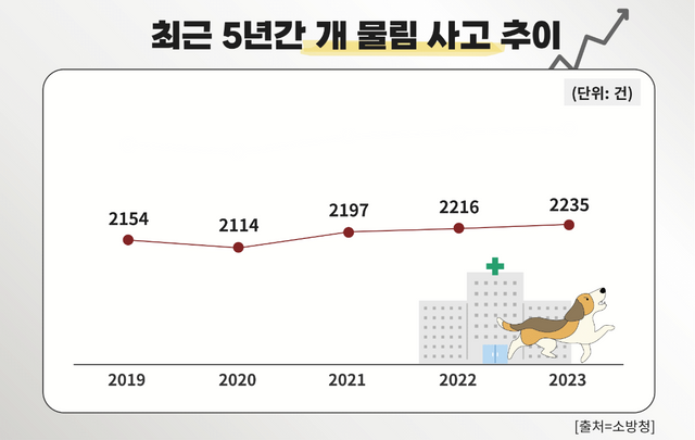 현재 우리나라에서 개가 사람을 물어 생기는 피해 건수가 더는 무시할 수 없을 정도로 늘어나다 보니 경각심이 필요한 상태다. 소방청에 따르면 지난 2019년부터 2024년까지 5년간 개 물림 사고로 인한 환자 이송 건수는 1만916이다. 개에 물려 구급차에 탄 사람이 하루 5~6명이라는 얘기다.