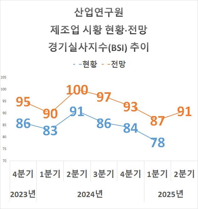업종별 매출 지표도 대체로 나빠졌다. 반도체가 88에서 70으로 내린 것을 비롯해 무선통신기기(98→71), 자동차(91→83), 조선(101→87), 철강(74→68), 이차전지(87→69) 등 대부분 품목이 내렸다. 12개 조사 업종 중 디스플레이(81→89)와 가전(89→90)만이 소폭 상승했으나 100에는 미치지 못했다.