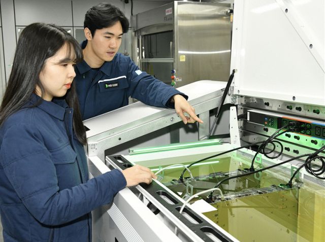 액침냉각 설비에 담긴 냉각유와 서버를 테스트하고 있는 HD현대오일뱅크 직원들. ⓒ HD현대오일뱅크