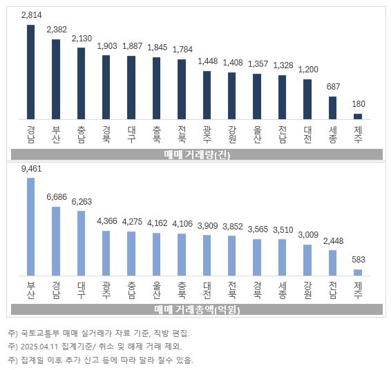 특히 세종시의 3월 거래량은 687건으로 전달(349건)의 두 배, 지난 1월(266건)과 비교하면 2.6배 증가했다. 1월 대비 증가율은 전국 최고 수준이다. 거래총액은 3510억 원으로 1월 대비 2.8배 증가했다. 가격 조정 이후 저가 매물이 소화된 영향과 대통령 세종 집무실 설치 기대감이 거래심리를 자극한 것으로 직방은 보고 있다.