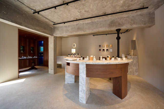 SW19 성수 스토어의 중심을 잡아주는 이 공간은 이름처럼 SW19의 주요 향들을 만날 수 있는 핵심적인 장소죠. 중앙에 자리한 센터피스는 시계의 구조에서 영감을 받아 시간의 조각들이 맞물리며 하나의 형태를 이루는 이미지를 건축적으로 풀어낸 것이 특징입니다.