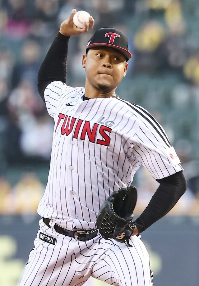 지난 15일 서울 송파구 잠실야구장에서 열린 프로야구 '2025 신한 SOL 뱅크 KBO리그' 삼성라이온즈와 LG트윈스의 경기에서 LG 의선발투수 에르난데스가 1회초 역투하고 있다. LG트윈스는 16일 잠실구장에서 열리는 삼성라이온즈전을 앞두고 에르난데스를 1군에서 말소했다. 1군 말소 사유는 부상이었다. 이와 관련해 LG트윈스 구단 관계자는 뉴스1에 "에르난데스가 오른쪽 대퇴부 대내전근 손상 진단을 받았다"라며 "회복까지 약 6주가량 소요될 예정이다"이라고 밝혔다. / 뉴스1