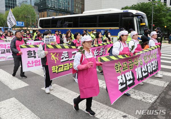 정 부본부장은 "절단기에 손이 끼인 동료가 119에 실려 나간 날 조리실무사들은 뛰는 가슴을 안고 다시 조리를 시작했다"며 "경기도에선 삼부장에 깔려 하반신 마비가 된 사례도 있었는데 학교장은 급식노동자들을 설득해 바로 다음날부터 간편식, 사흘 뒤엔 정상급식을 강행했다"고 말했다.