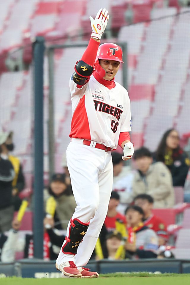 교체를 고민하지 않은 건 아니었다. 이범호 감독은 "내가 느꼈을 때 선우가 외야에 있으면서 수비에 집중하려는 모습을 굉장히 많이 보였다. (교체 없이) 한 번 더 치고 난 뒤에 1-0 상황이면 빼도 되겠다고 생각했다"라고 말했다. 타순을 고려한 결정이었다. 컨디션이 워낙 좋았던 KT 선발 고영표(6이닝 3피안타 11탈삼진 무실점)가 마운드에서 내려간 뒤 8회 오선우의 타선이 돌아온다는 걸 고려했다. 오선우의 타격감이라면 불펜을 공략할 수 있다는 판단이었다.