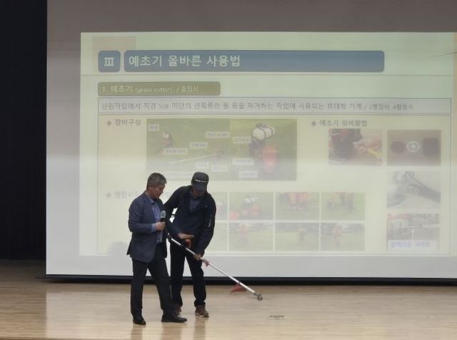 산림조합중앙회의 전문 강사를 초빙해 진행한 교육에는 숲가꾸기패트롤, 산림병해충예찰방제단, 임도관리단 등 기계톱을 사용하는 직종의 근로자 약 200명이 참석했다. 참석자들은 기계톱·예초기 사용 시 ▲안전 수칙, ▲보호 장비 착용 방법, ▲관리 방법, ▲사고사례 등을 집중해서 청취했다. 비슷한 사고가 발생하는 것을 막기 위해 산림 분야 안전사고 사례를 소개하고, 재발 방지 대책도 교육했다.