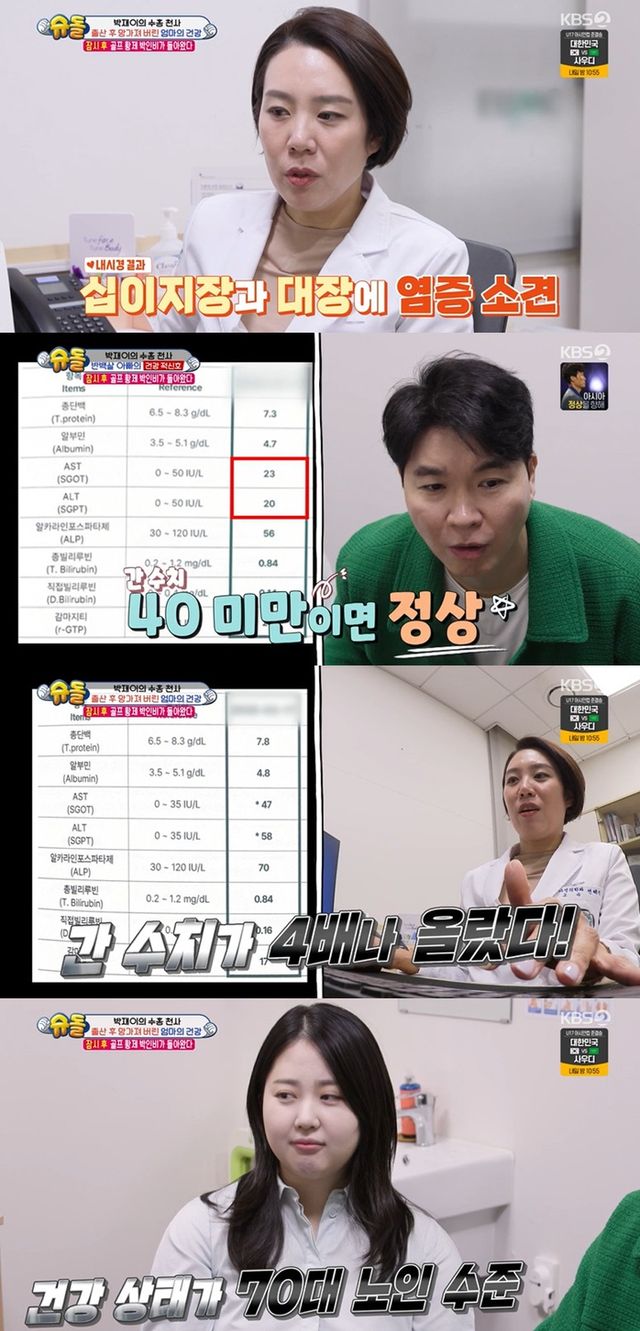 하지만 문제는 김다예의 건강 상태였다. 의사는 "대장 내시경을 이번에 처음 했다. 십이지장과 대장에 염증이 있다"며 몸 곳곳에 퍼져 있는 염증들을 언급했고, 박수홍이 지방간을 언급하자 "간 수치가 47에 58이다. 원래 17에 11"이라며 4배나 오른 간 수치를 언급했다.