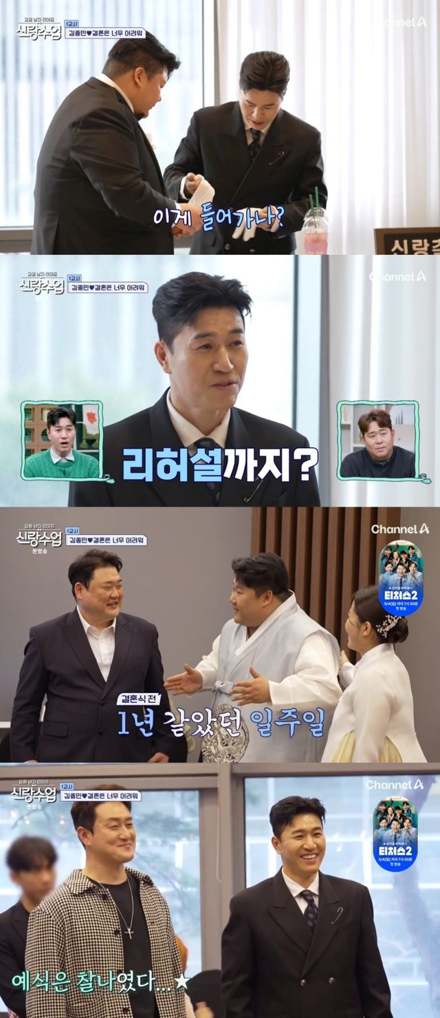 16일 방송된 채널A '요즘 남자 라이프-신랑수업'(이하 '신랑수업') 159회에서는 김종민이 친한 코미디언 김태원의 결혼식을 돕는 모습이 전파를 탔다.