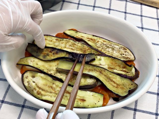 오븐용 그릇에 구운가지를 겹치지 않게 깔고 그라탕소스를 발라요.