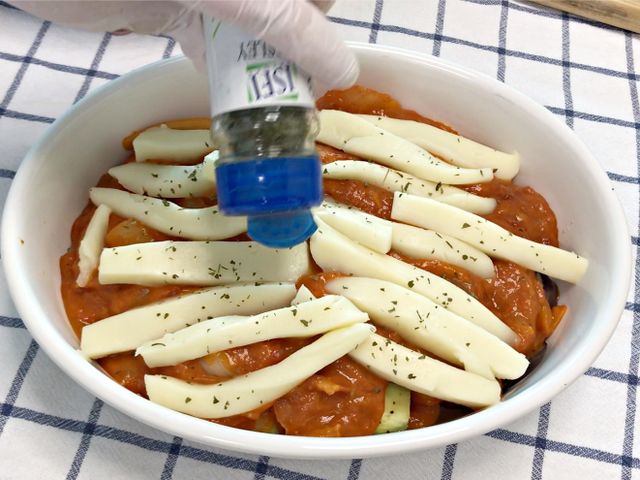 소스 위에 모짜렐라치즈도 솔솔 뿌리고 이 순서로 층층이 쌓아주세요.